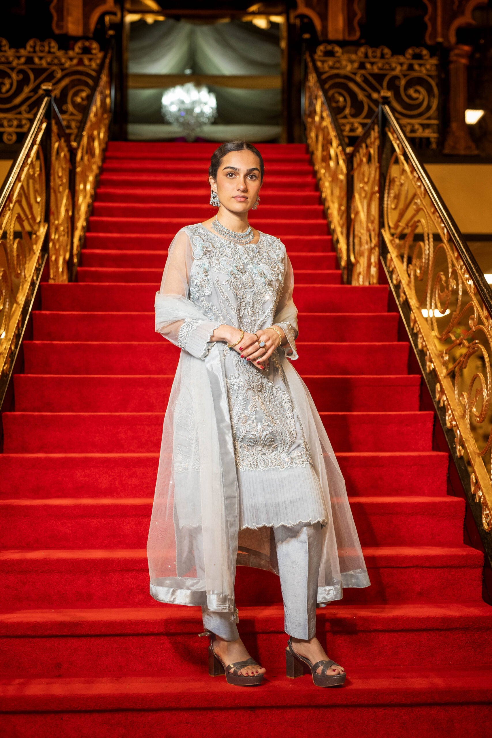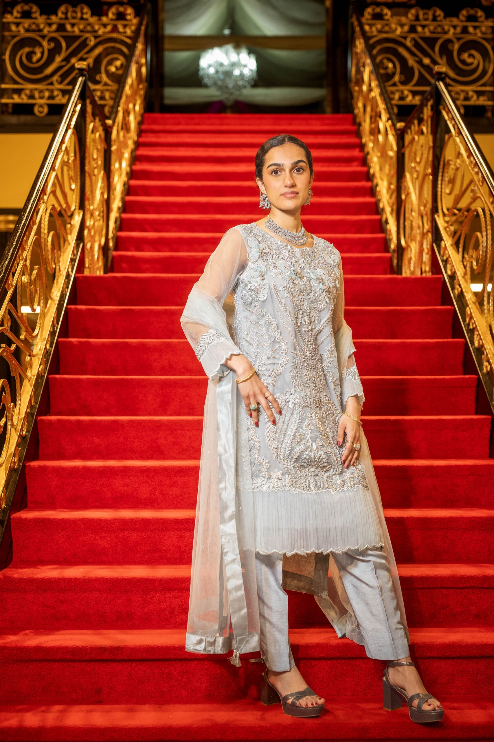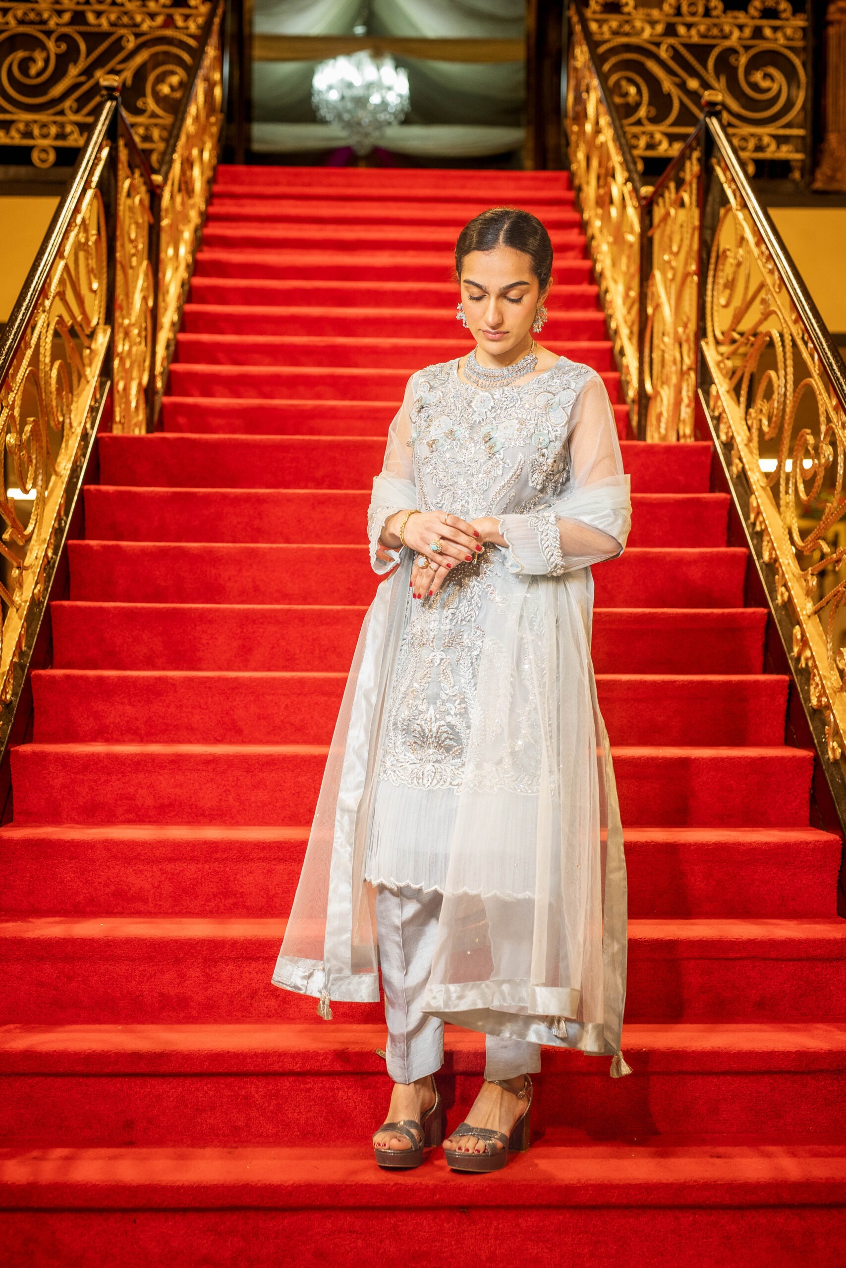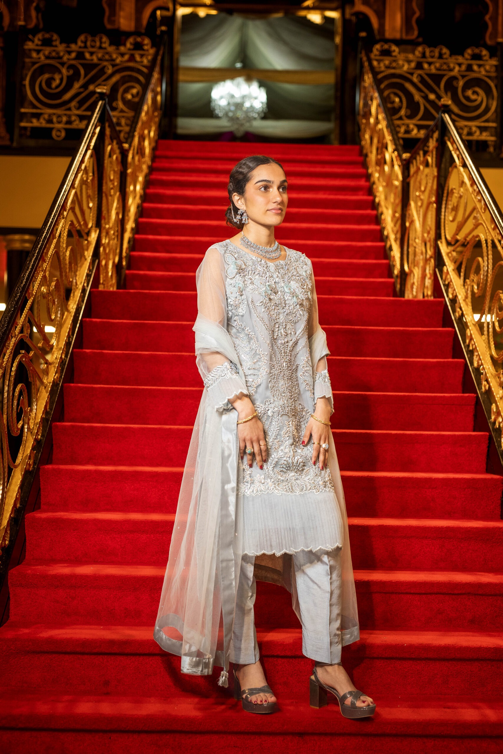 The Glacier Lake is the perfect fusion of timeless and modern. I exceeds radiant charm with its interplay of sequins, intricates threadwork, and glistening crystals. The set features a finely with tailored organza shirt and beautify with swarovski spray on dupatta paired with azar Pants having hanging crystals border.