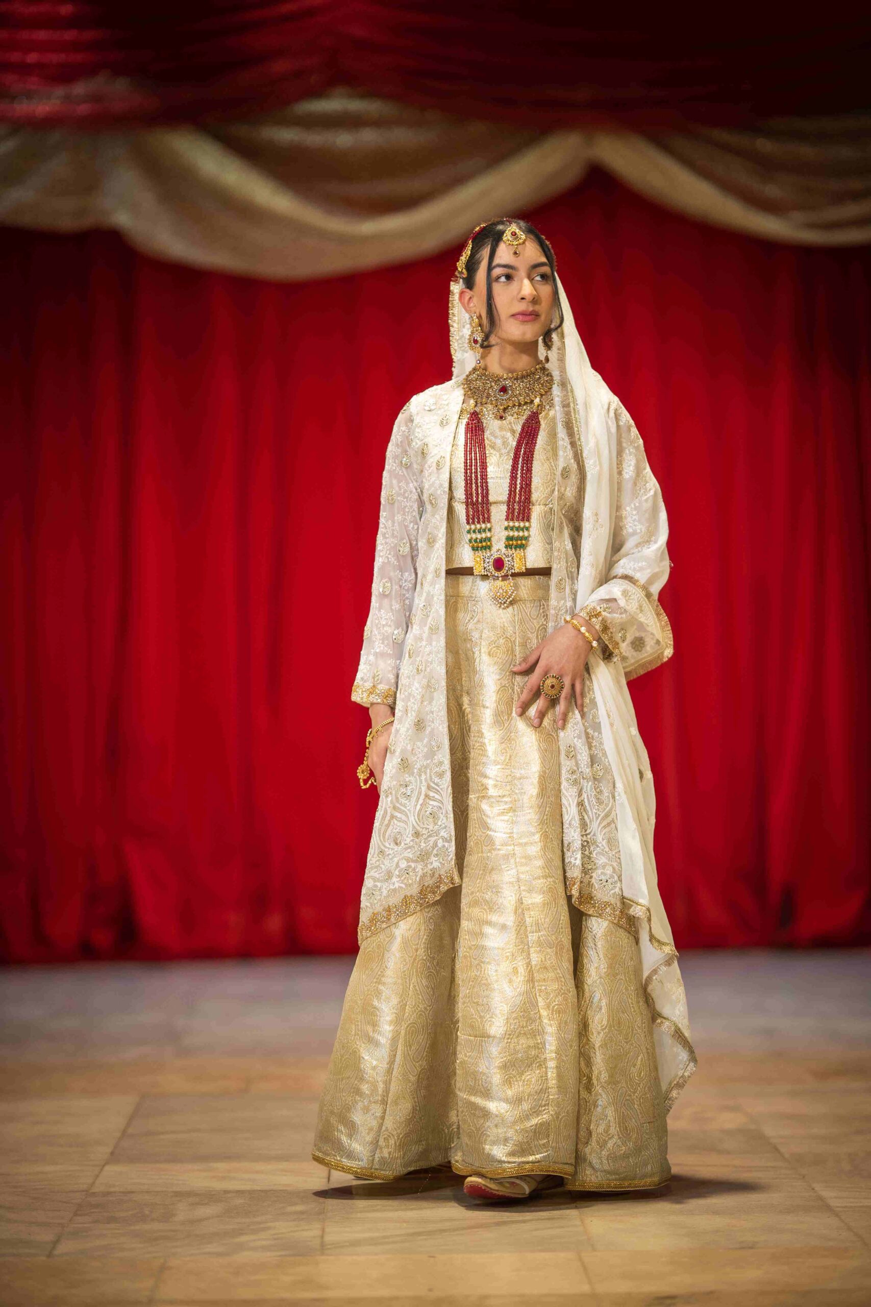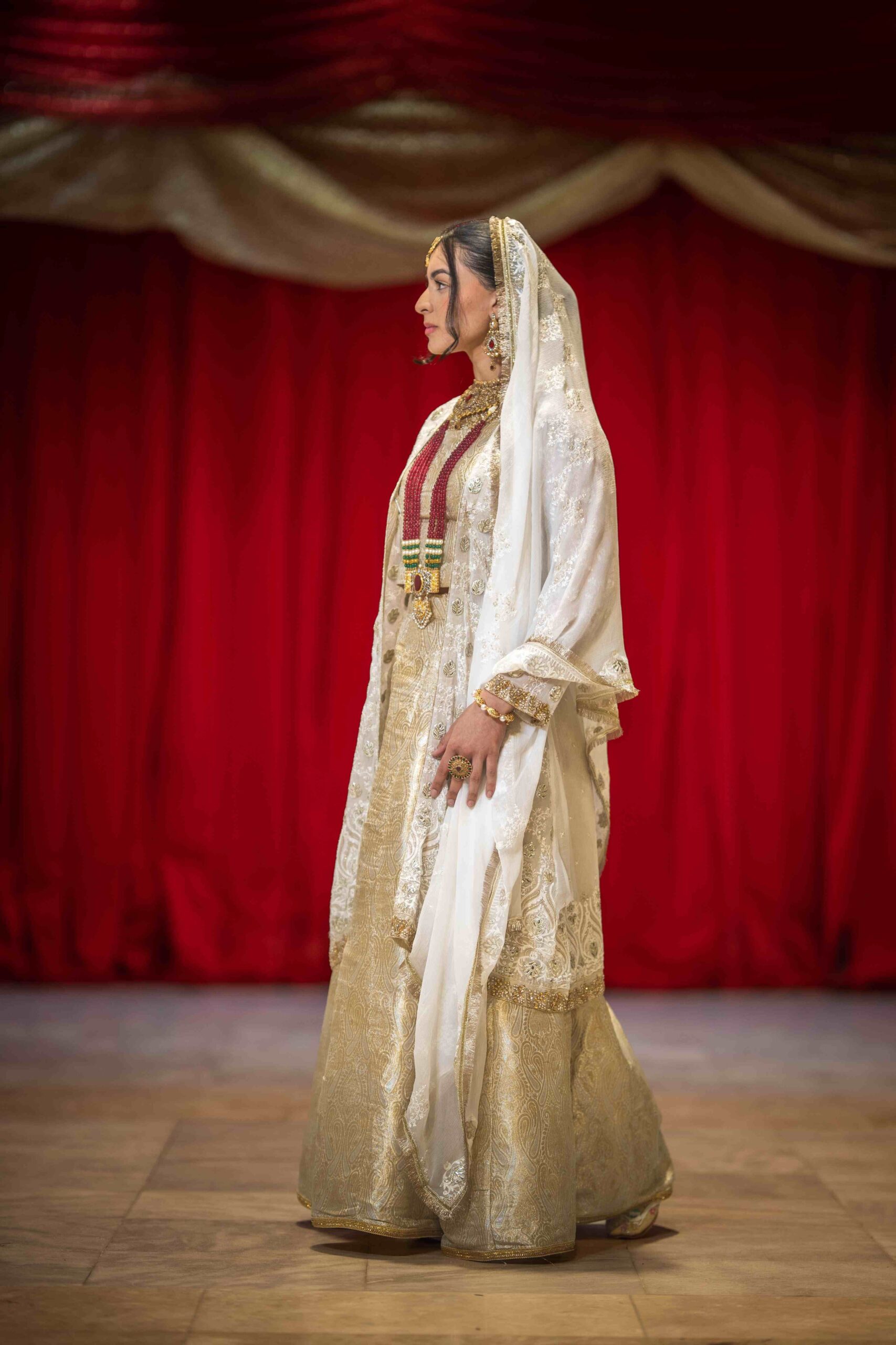 This is a stunning outfit that is perfect for special occasions. It features a beautifully designed embroidered pure crinkle chiffon gown with a mesmerising gold lehenga choli. To complete the set, there is a pure crinkle chiffon embroidered dupatta that provides a delicate and ethereal finishing touch. The outfit drapes effortlessly, adding an air of elegance and grace to your overall look.