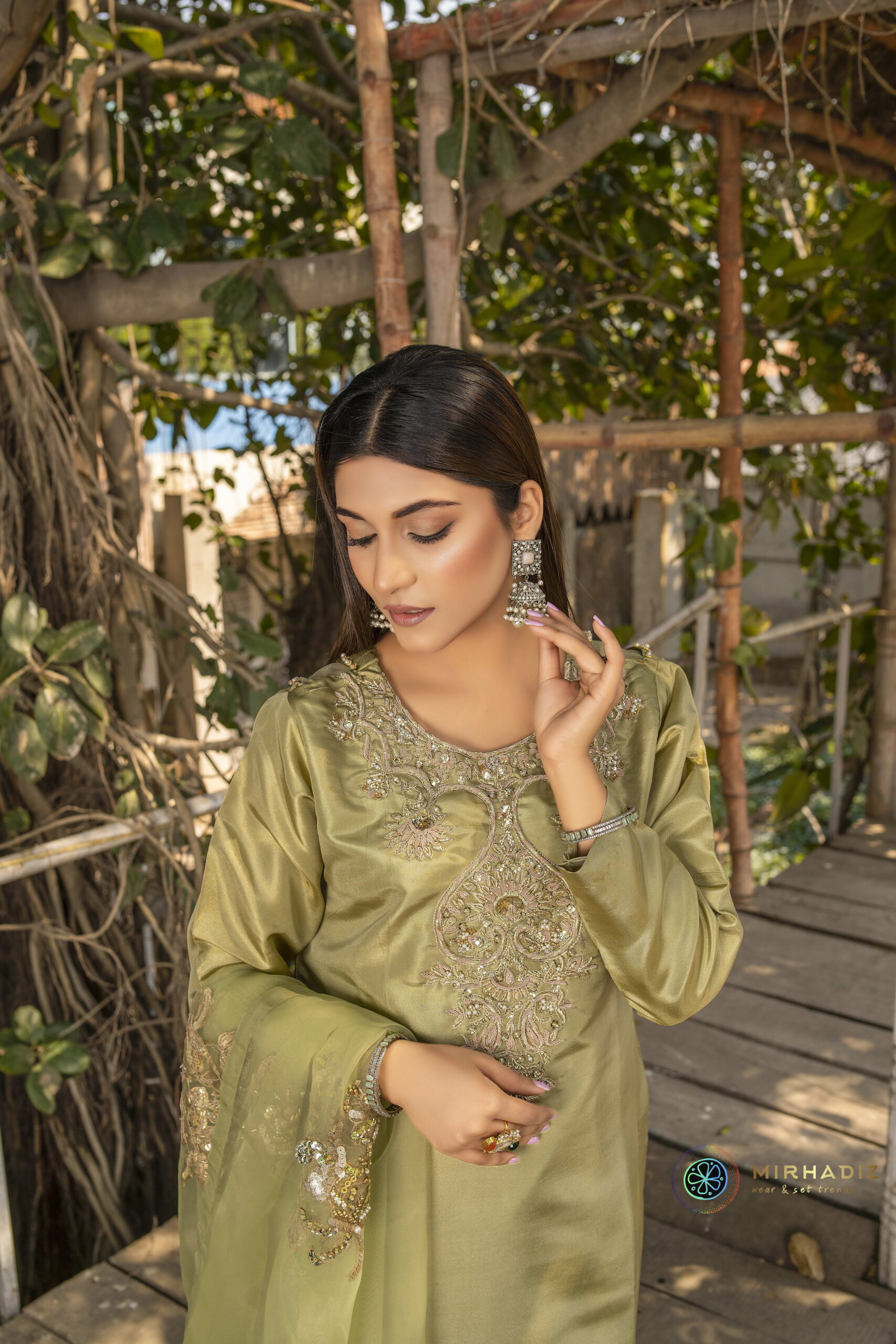 Indulge in timeless elegance with our exquisite lemon green dress, adorned with intricate zardozi handwork along the neckline and hem. The dupatta features delicate zardozi detailing in all four corners, adding a touch of opulence. Complete with outstanding tassels, this ensemble is perfect for your most special occasions.