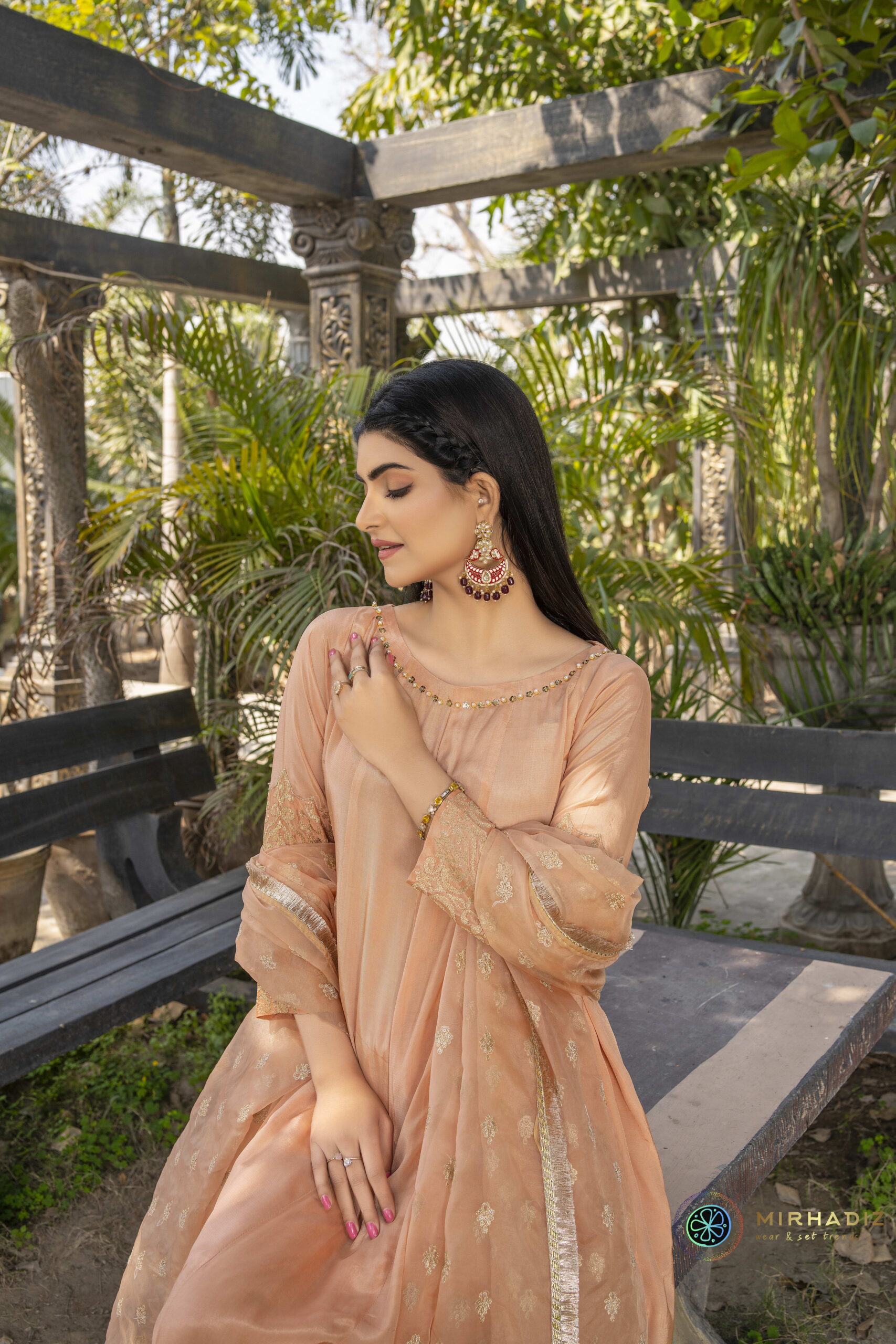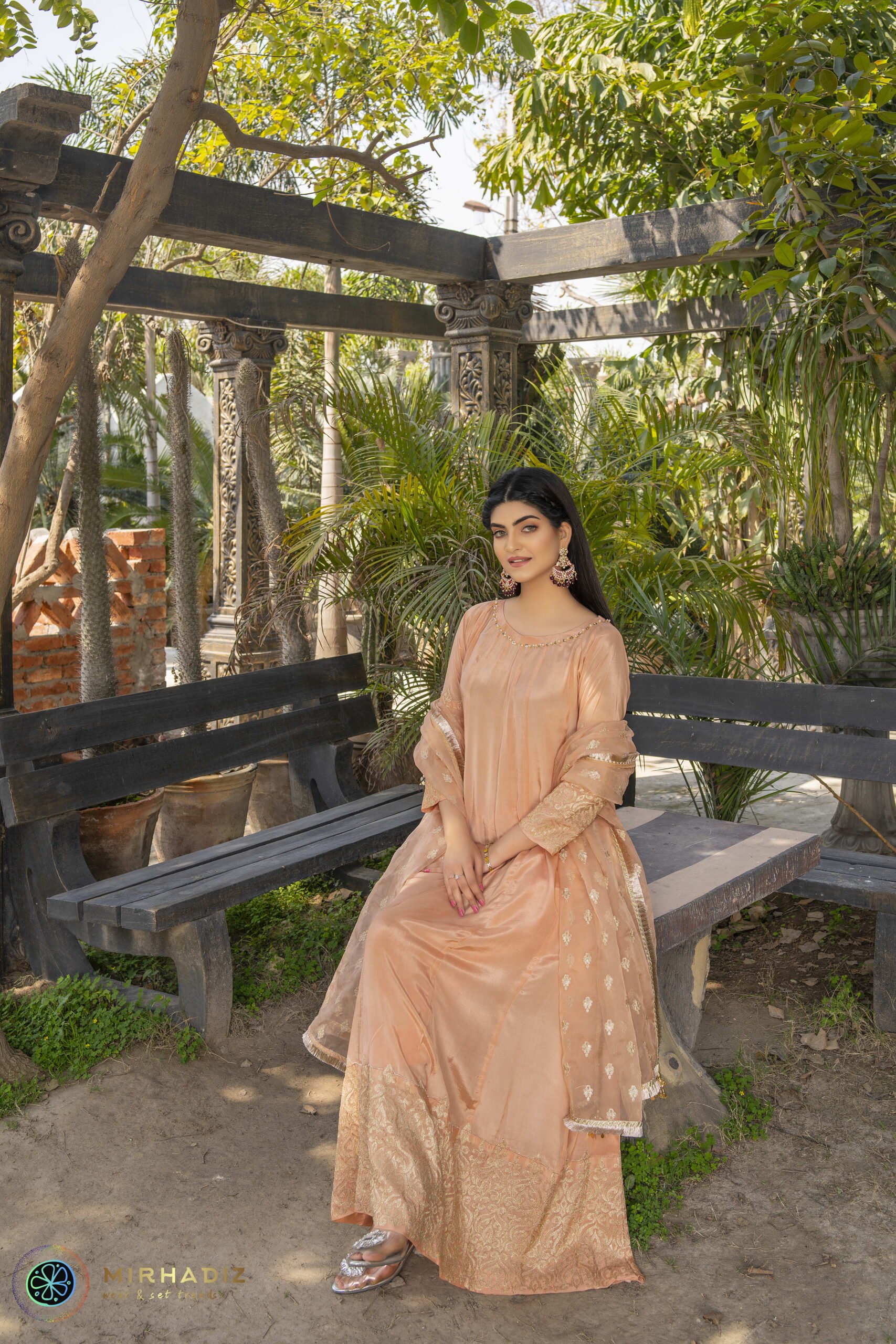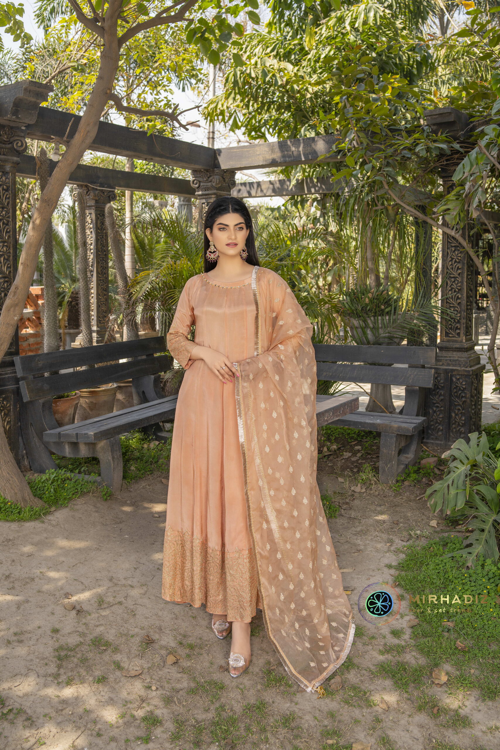 Introducing our “Peach Patel” frock dress, a stunning addition to your wardrobe. This effortlessly chic ensemble boasts a tilla heavy embroidered border along the hem and sleeves, exuding timeless charm. The intricately adorned neckline with sequins and pearls enhances its elegance further. Complete with a dupatta featuring a delicate tilla motif spray, edged with kiran and dancing tassels, this ensemble is perfect for any occasion, radiating grace and sophistication.