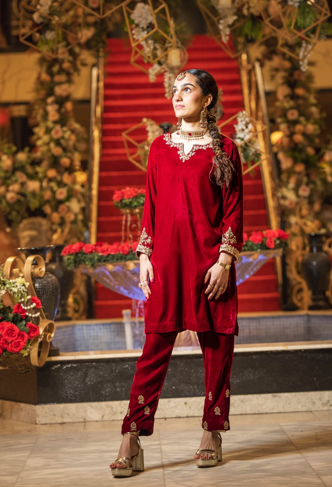 Introducing our creation: a mesmerizing maroon velvet ensemble that exudes elegance and sophistication. Embellished with intricate gold zardozi work adorning the neckline and sleeves, this ensemble is a masterpiece of craftsmanship. Handcrafted detailing on the wide-leg trousers adds a touch of opulence, making it perfect for any occasion.